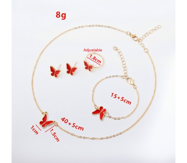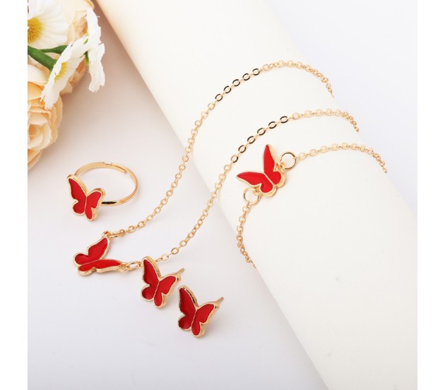 Combo Set of 4 Red Butterfly Necklace Set Stud Earring Set With Adjustable Finger Ring and Bracelet Gold Chain Plated Stylish Valentine Birthday Gift For Women and Girls