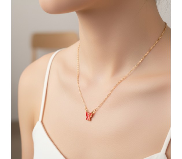 The centerpiece of this collection is the exquisite butterfly necklace. This chain pendant set for women stylishly showcases a vibrant red butterfly pendant, suspended from a gold-plated chain. It is an ideal butterfly necklace set for girls who appreciate fashionable and thematic jewelry.