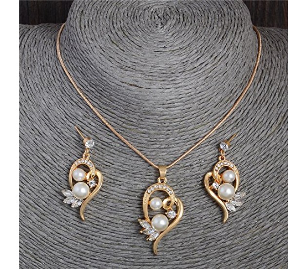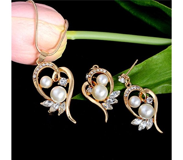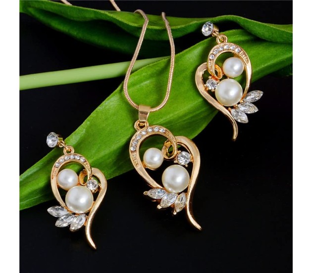 Heart Shape Pearl With Crystal Rhinestones in Gold Plated Pendant Earring Jewellery Set for Girls and Women