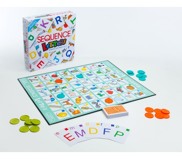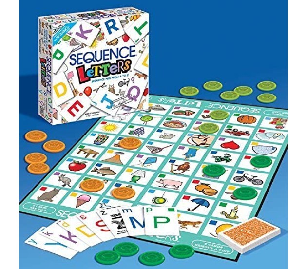 Excellent Family Fun Indoor Educational Board Game which teaches kids to learn alphabets and letters by making a sequence of coins and provides hours of fun for the family. Players sound out the letter on their card, match it to the beginning sound of the picture on the game board for ages 4-7 and 2-4 players.The sequence letters game will help your kids to learn the alphabets, color and shape recognition.1 x playing board, 52 cards, playing chips, game instruction.Colored squares on the cards and game board help with faster recognition. When you have 3 of your chips in a row, you've got a sequence. Ages 4 and up, 2-4 players