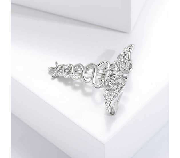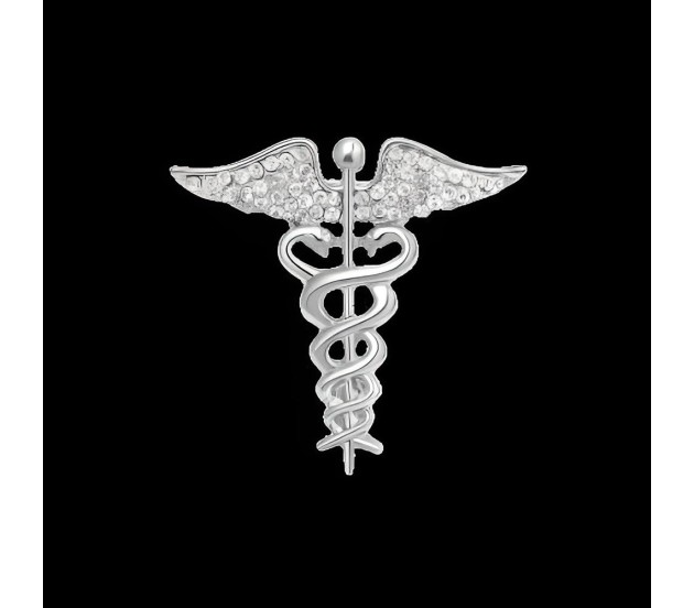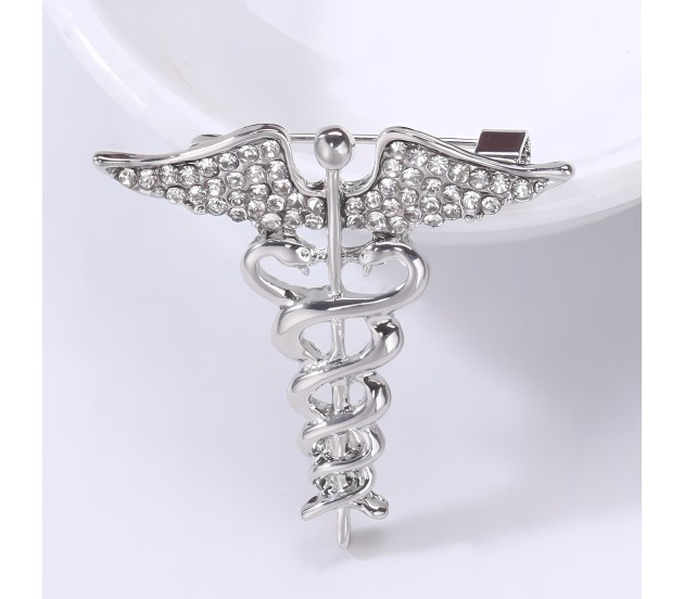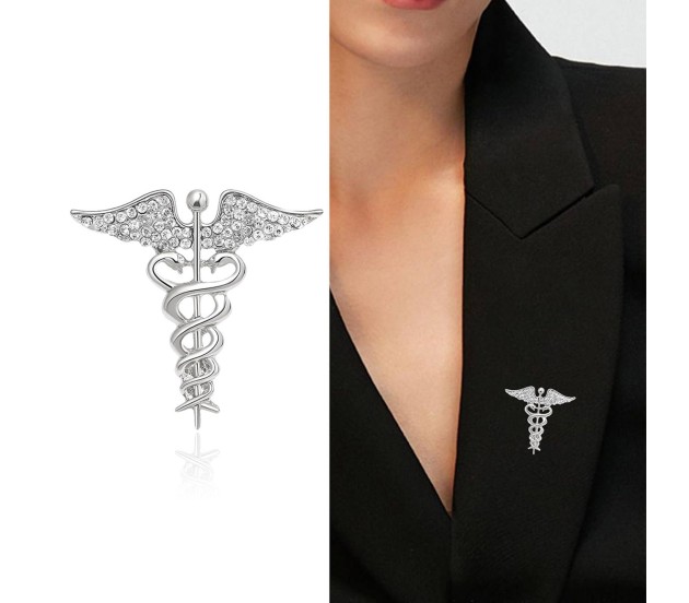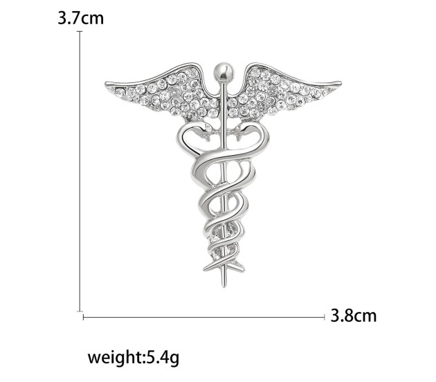 Medical Caduceus Doctors Silver Plated Crystal Rhinestone Unisex Brooch Lapel Pin Metal Stainless Steel Doctor Angel Wings Lepel Blazer Suit for Men and Women